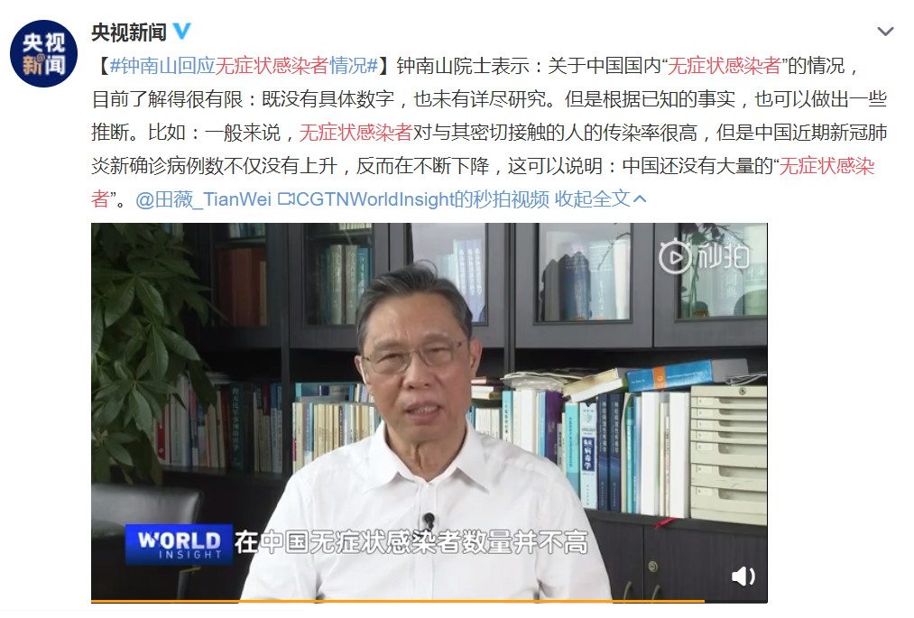 “就目前这个阶段来说,我不认为中国存在大量的无症状感染者。”